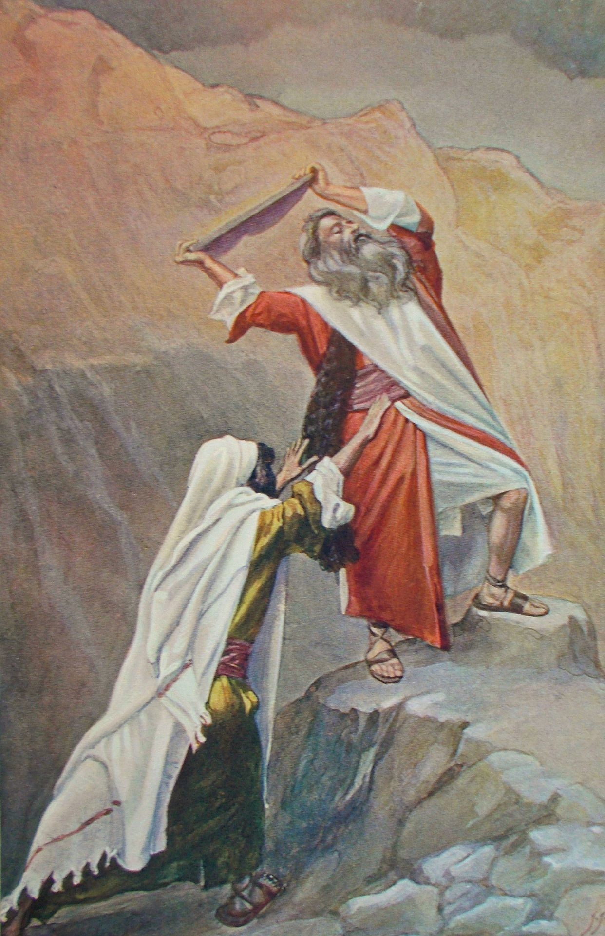 モーセは神から与えられた「十戒」の石の板を持って下山し、イスラエルの人々のもとに戻ります。金の子牛の前で飲み食いし、喜び踊っている人々を見て、モーセは激しく怒って、神からいただいた大切な石の板であるにもかかわらず、投げつけて砕いてしまします。